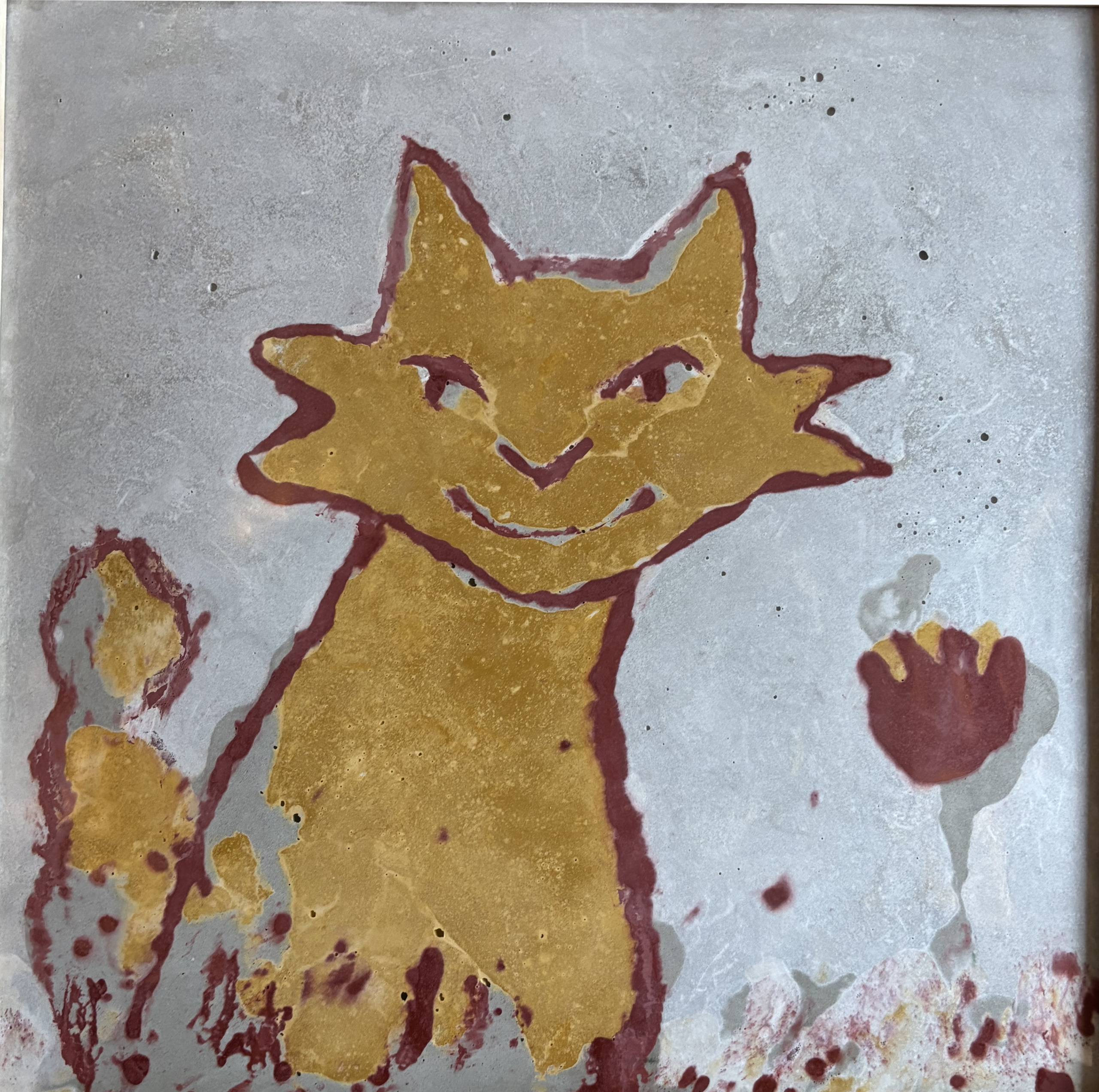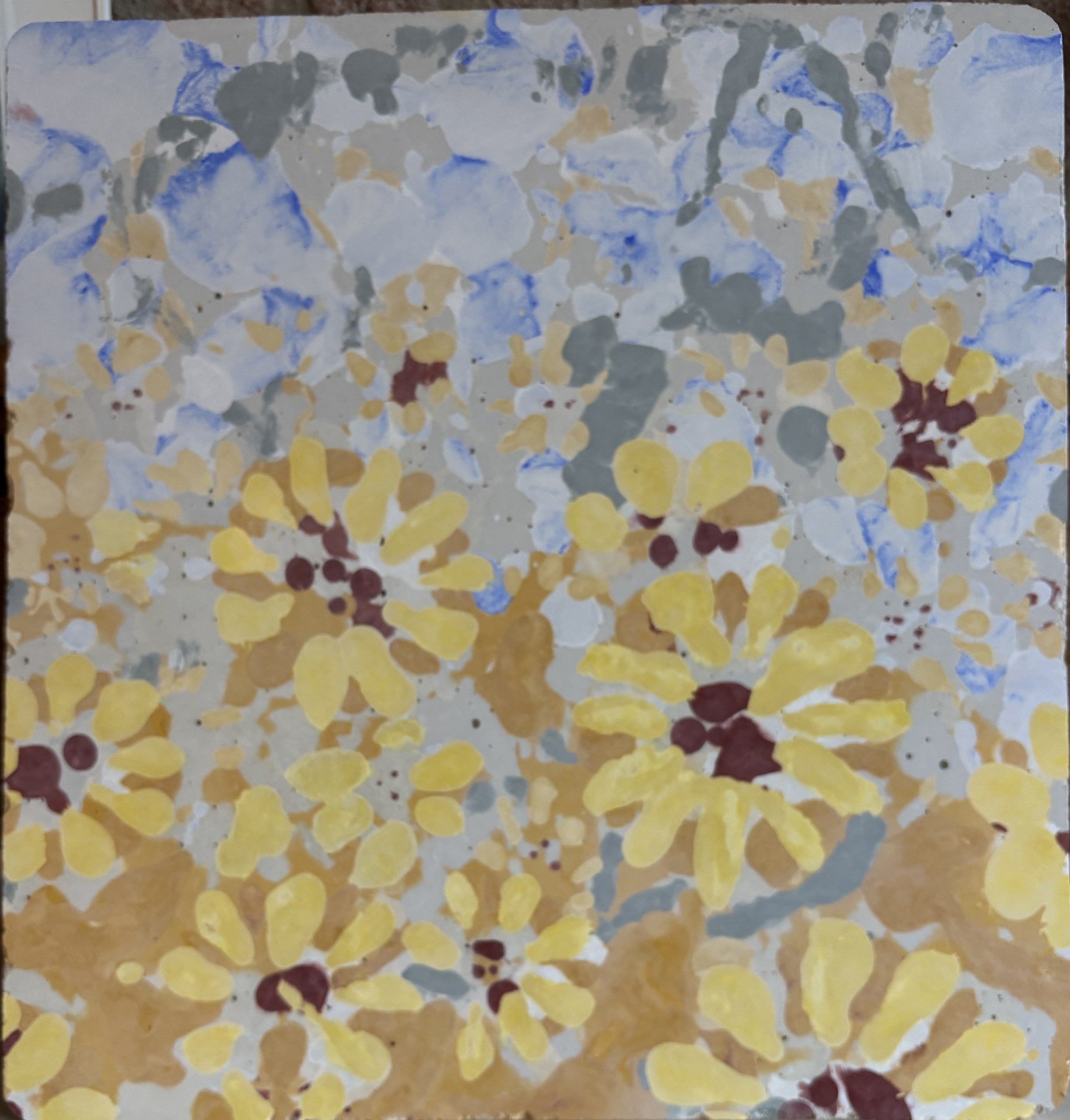 Mes tablettes et sculptures sont faites d’un mélange de sable (celui des châteaux merveilleux de mon enfance) et de ciment enrichis de pigments. Je travaille ce matériau vivant par strates ; il bouge, il réagit et demande du temps à se fixer. Contrairement au béton des villes, le mien est coloré, lisse et agréable au toucher.